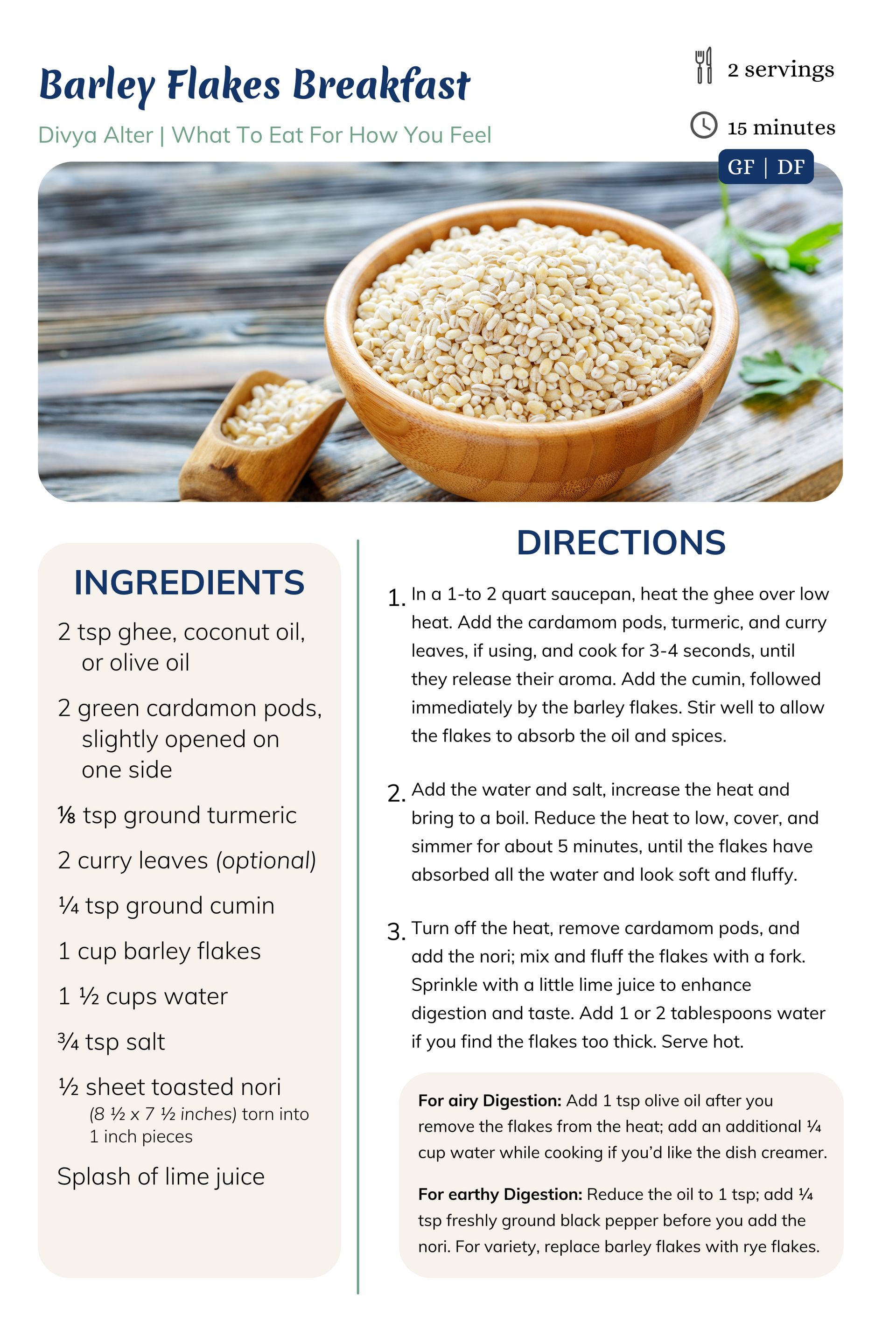 Barley flakes are grounding yet light and filling enough to keep you going until lunch. Because they’re made from pressed whole barley grains, the nourishing bran remains intact, preserving the ojas building minerals and fiber. This gentle pressing process makes them quick to cook and easier to digest, offering the perfect balance of sustenance and lightness to carry you through the morning 💜
